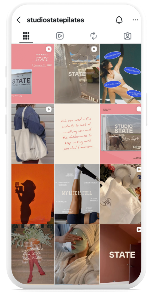 I approached State Pilates’ social content by inviting viewers into the behind the scenes process of building the studio, sharing construction updates, decorating moments, and training prep in a way that felt personal and interactive. Through playful trends and monthly Spotify playlist features, I helped create a sense of community and excitement leading up to launch.