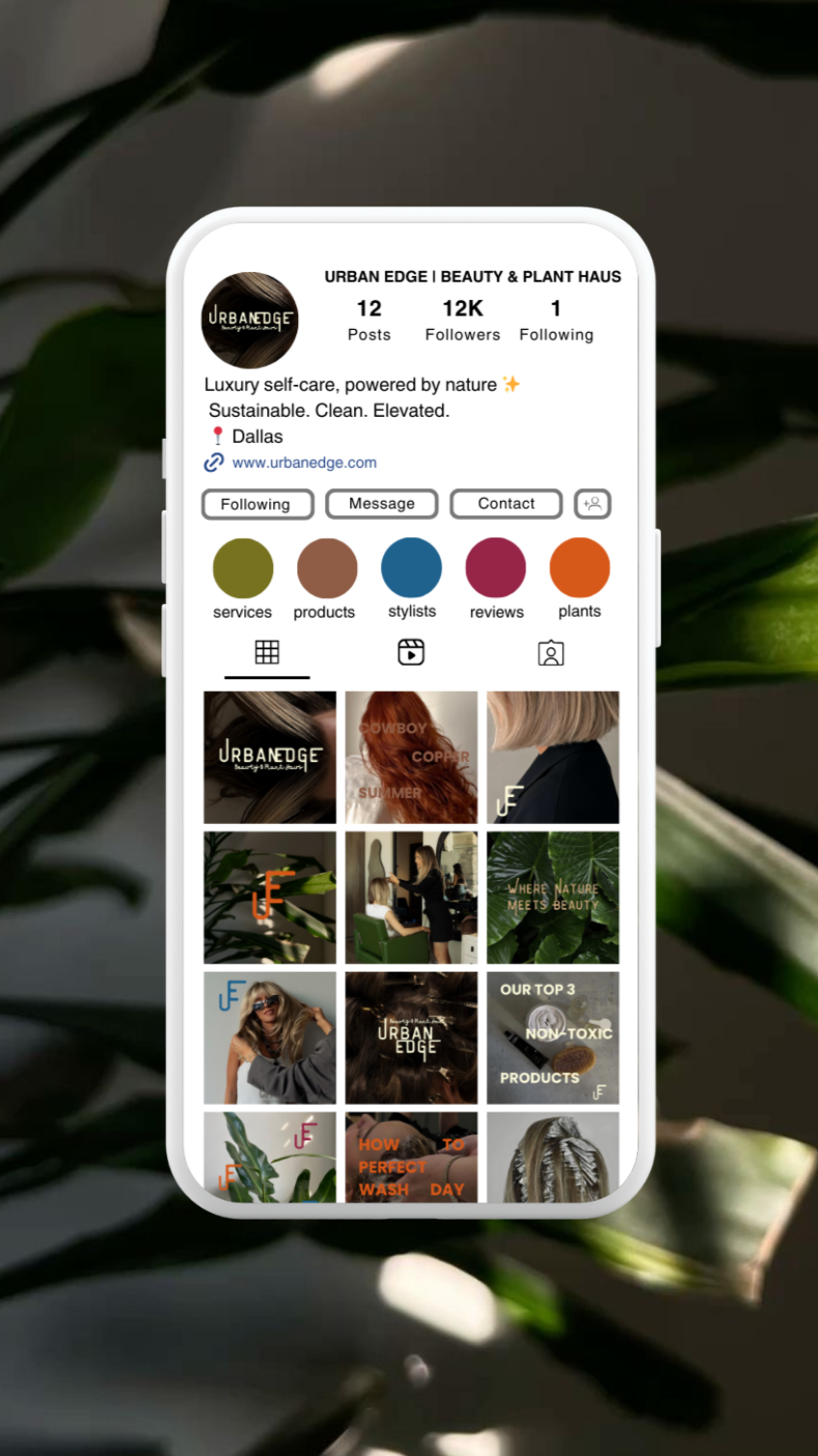 Urban Edge is a lifestyle-forward salon and plant boutique concept that harmonizes natural beauty and intentional wellness. Rooted in the mantra "Where Nature Meets Beauty," the brand draws its identity from the tactile, grounded energy of botanical environments paired with the sleek sophistication of modern hair artistry. It speaks to the urban woman who is not only style-conscious but also mindful about the products she uses and the spaces she occupies.